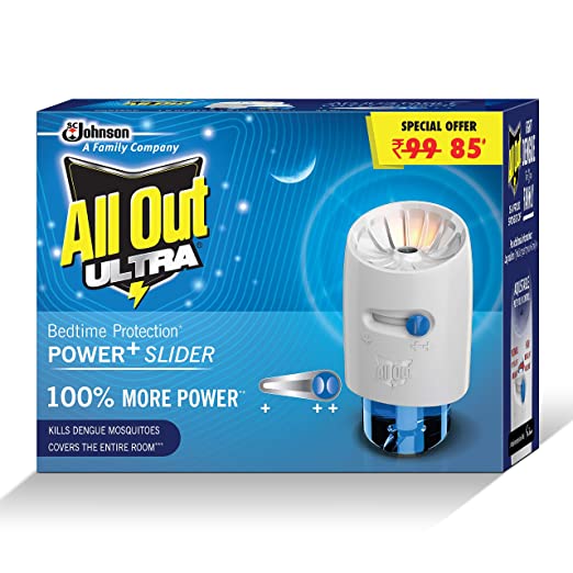 The pack of All Out Total Faster contains 45 liquid vaporizer refill bottles and a machine. The machine is designed to heat the refill bottles and release the active ingredients into the air, creating a protective barrier against mosquitoes and other flying insects. Each refill bottle lasts for up to 60 nights, providing long-lasting protection against mosquitoes and other flying insects.