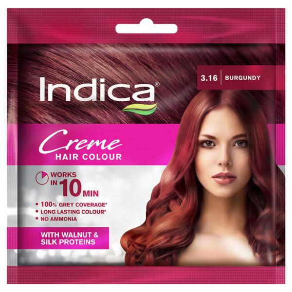 Cover your gray hair with Indica 10 Min Burgundy 3.16 Creme Hair Colour. It works in 10 minutes to give your hair a new and long-lasting colour.