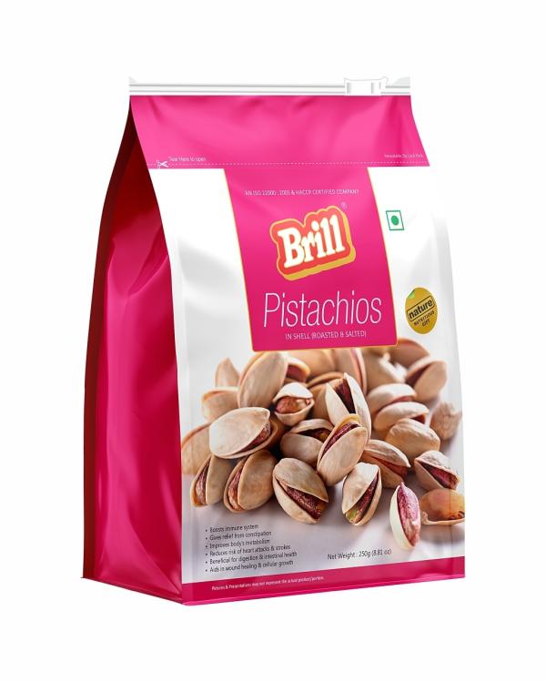 Brill Roasted & Salted Pistachios made into a wonderful and tasty snack. These pistachios are relished by children and grownups alike. Best as a serving for cocktails, evening snack or anytime munch. A 28-gram serving of pistachios contains good amounts of fiber, protein, potassium, zinc, phosphorus, vitamin B6, and manganese. They have a rich and nutty taste, and they contain other important nutrients too. The antioxidants in pistachios are some of the highest amongst nuts.